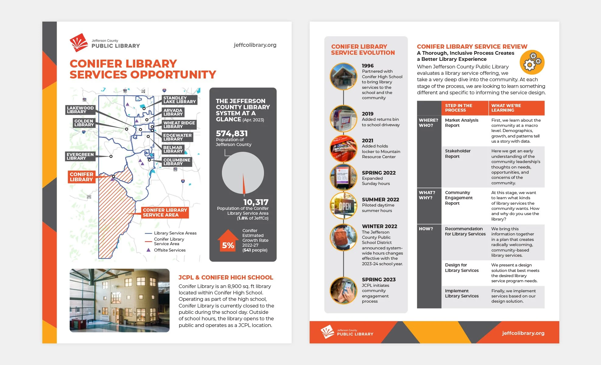Created our donor book to secure donations for legacy gifts at JCPL’s new standalone Conifer Library and fact sheets for community engagement.
